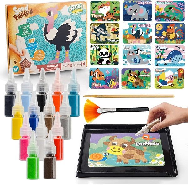 Sand Art Kit: Sand painting crafts kits 29 pcs include 12 pcs animal sand art picture cards,14 bottles colored art sand, sand table, bamboo skewers, and brushes, Colored sand painting wild animal cartoon patterns make the picture more vivid and interesting. Simple sand filling can trigger a kid's amazing artistic talent and exercise children's hands-on abilities.