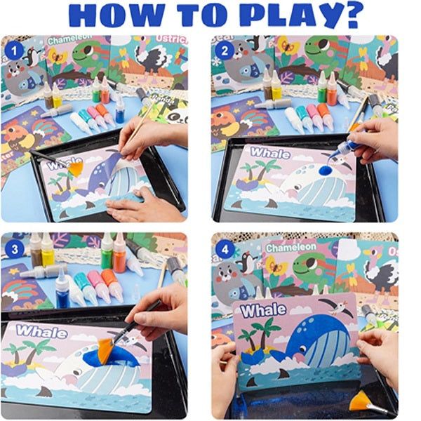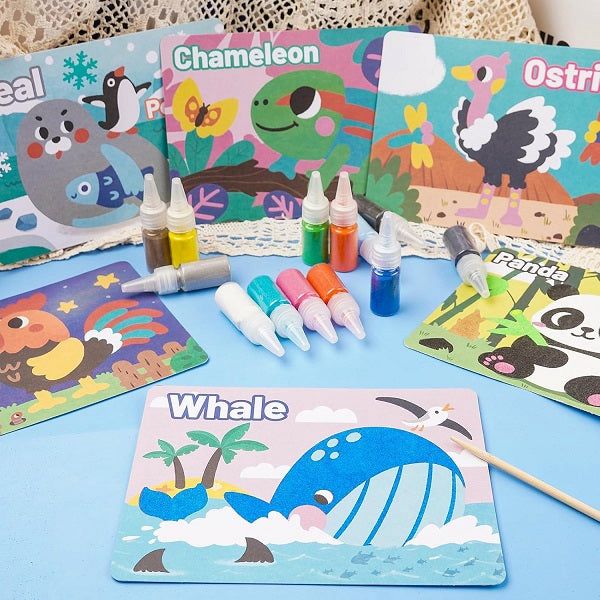 Sand Painting: Children can choose their favorite sand painting pattern, gently lift the sand painting sticker with a wooden stick, fill in the sand according to the color sticker or DIY, apply evenly, repeat the first two steps, and you can complete a beautiful sand painting. Ideal gifts suitable for boys and girls over 4 years old.
